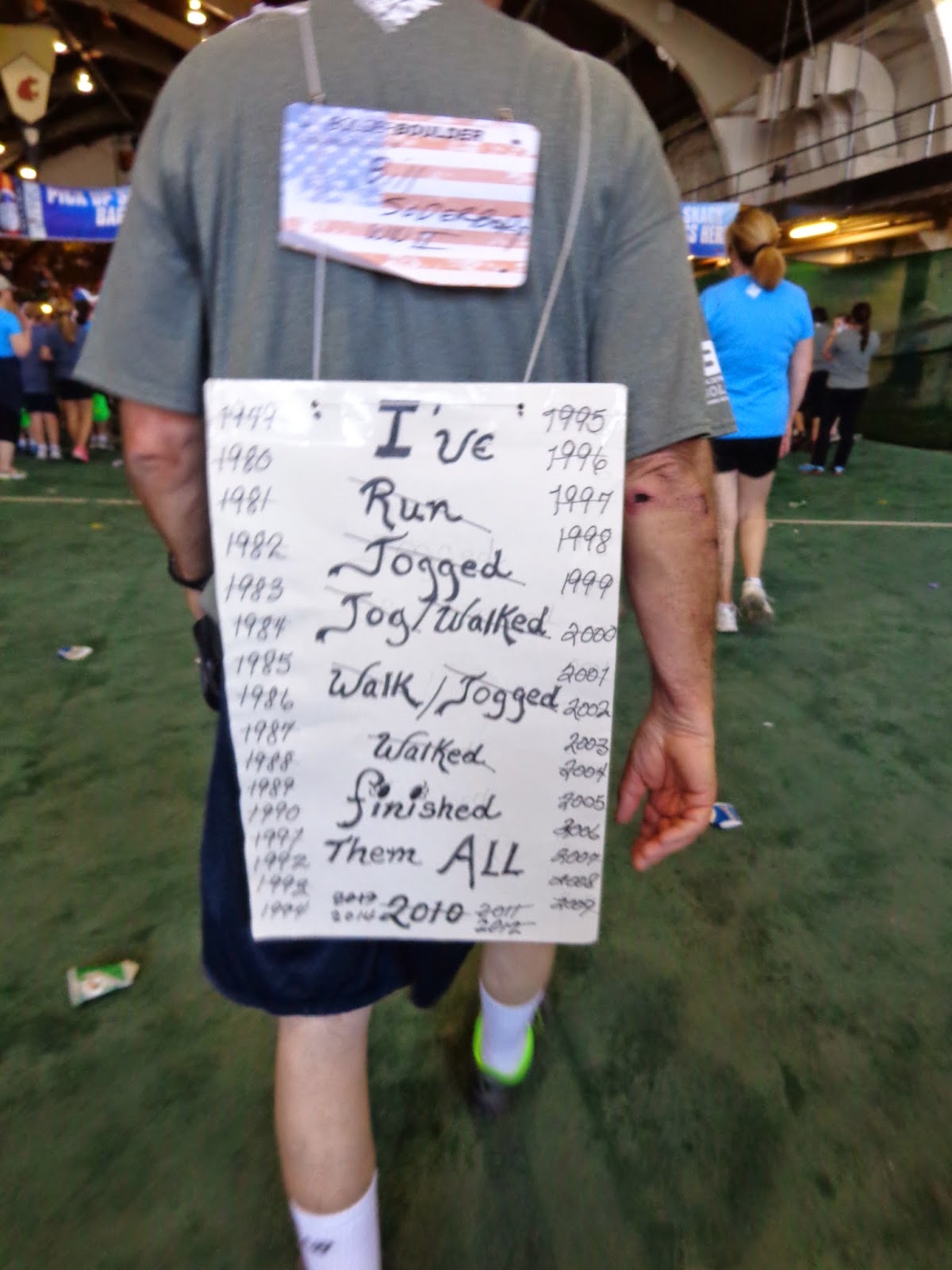 This is a bit out of order. This man in the blue hat was the last one to finish. They clear the course for the elite runners. His picture was on the big screen and the whole stadium stood and cheered him in. What an experience for him and for us. It brought tears to our eyes. This is what it is all about. Getting it finished and celebrating each others victories!